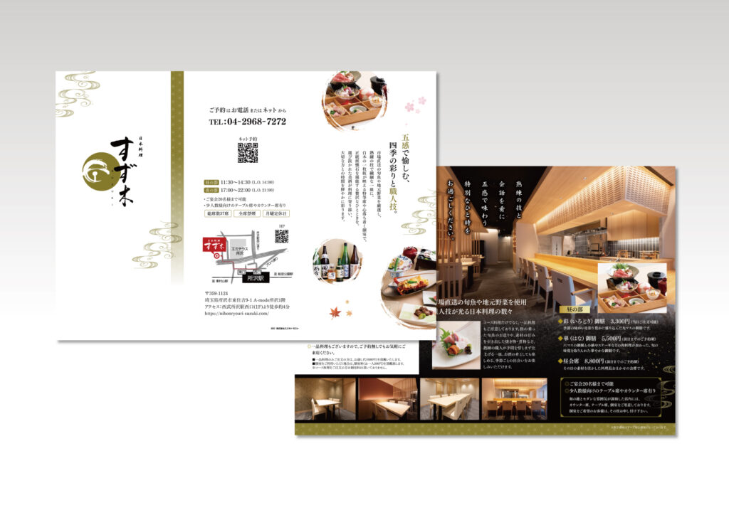 狭山市で親しまれてきた「おお津」様が、このたび店舗移転を機に「日本料理 すず木」として生まれ変わり、弊社では、三つ折りパンフレットのデザインを担当させていただきました。